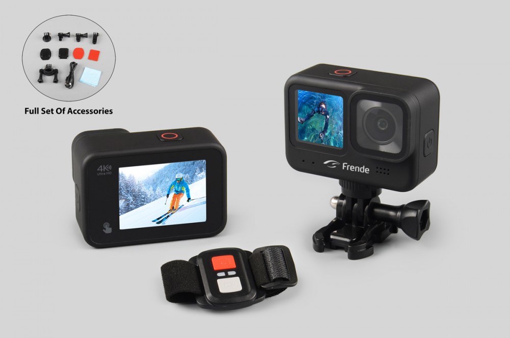 Actionkamera med to skjermer og fjernkontroll